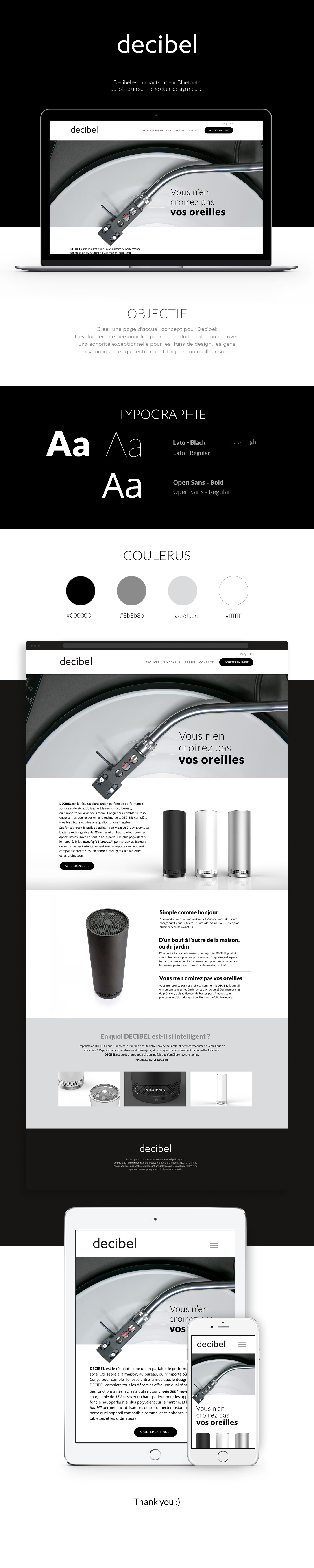 Student Project. Goal: Create a homepage concept for Decibel: Develop a personality for a high-end product with an exceptional sound for design fans, dynamic people, and for those who are always looking for à better sound.